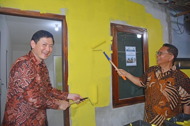 Presiden Direktur Summarecon Agung, Adrianto P. Adhi (kanan) melakukan seremoni simbolis mengecat salah satu rumah warga yang mendapatkan program Bedah 500 Rumah.